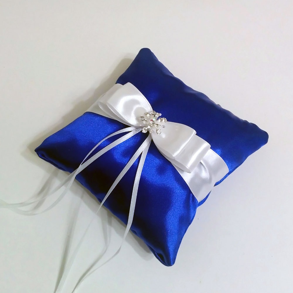 Подушечка для кілець ручної роботи, прикрашена атласною стрічкою та бантом та брошкою.