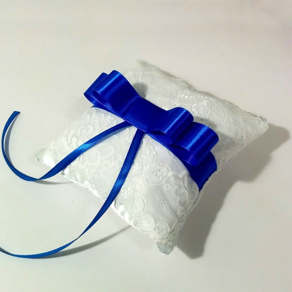 Подушечка для кілець ручної роботи, прикрашена мереживом та бантом з атласної стрічки.