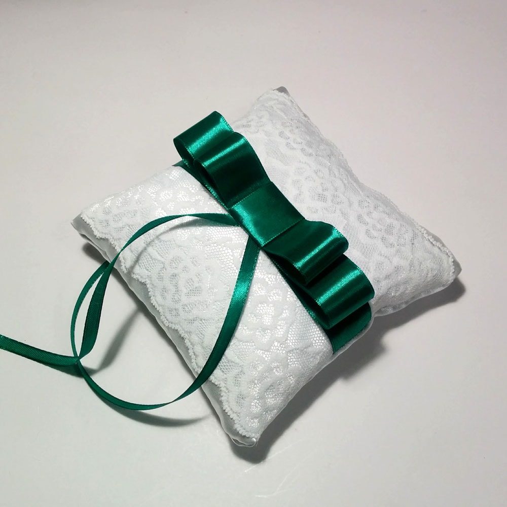 Подушечка для кілець ручної роботи, прикрашена мереживом та бантом з атласної стрічки.