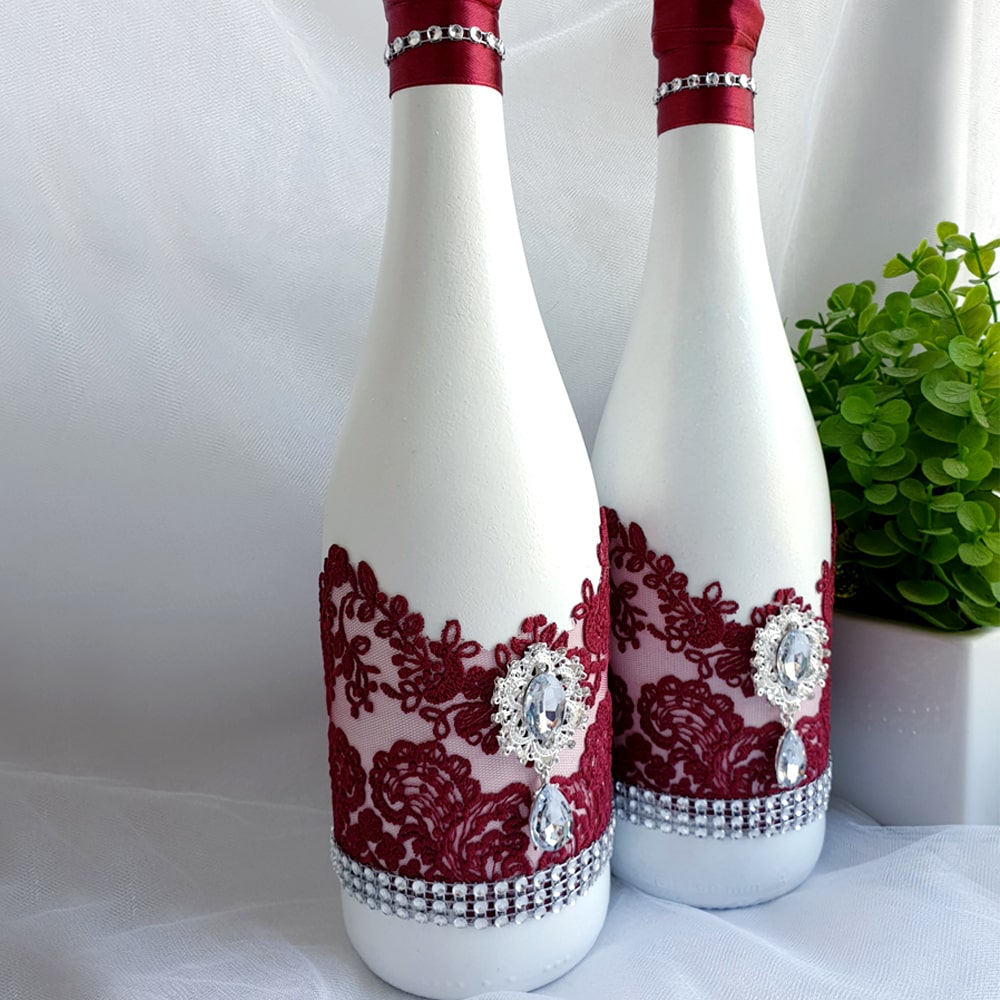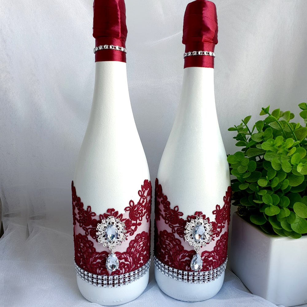 Декор шампанського на весілля ручної роботи з фарбуванням у білий колір та прикрасою мереживом, брошками та ін.
