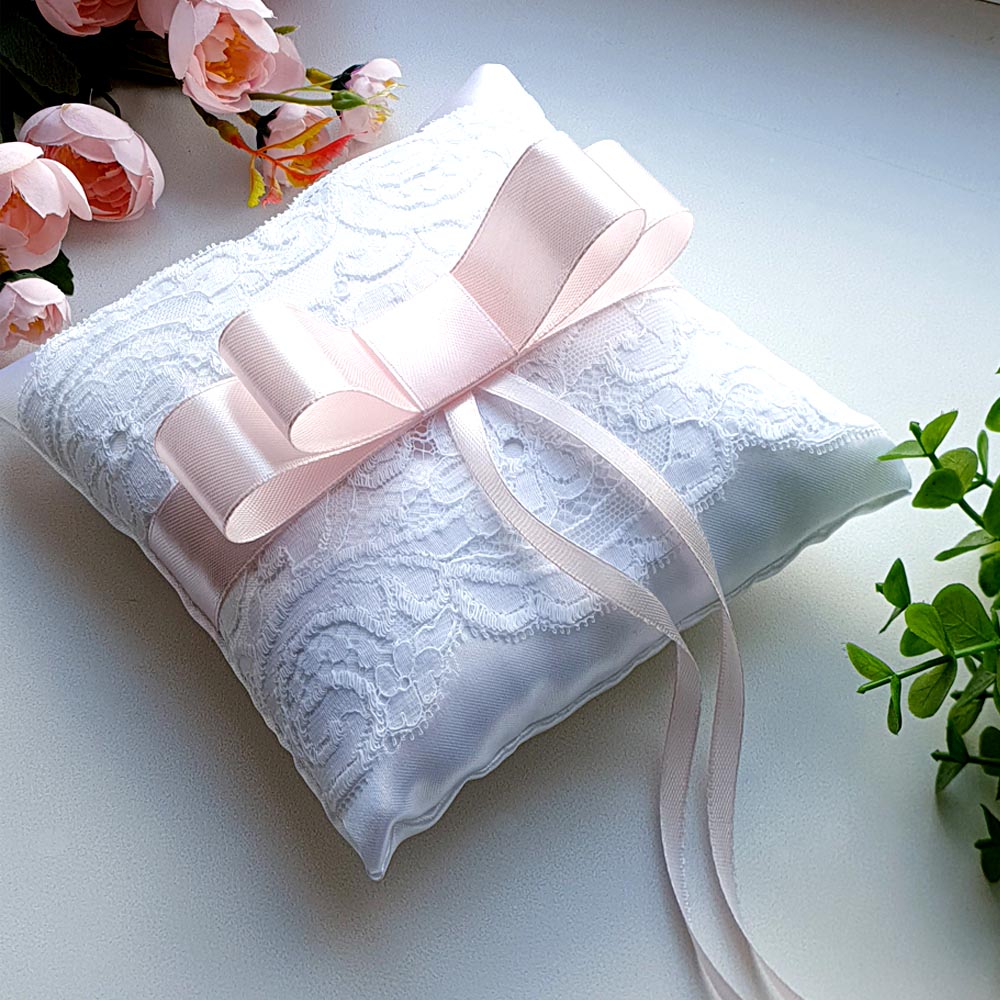 Подушечка для кілець ручної роботи, прикрашена мереживом та бантом з атласної стрічки.