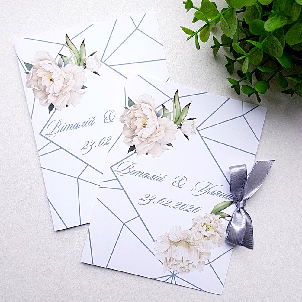 Запрошення йде з не зав'язаною стрічкою, опція зав'язування стрічки коштує 1,5 грн. - якщо потрібно, вкажіть її в коментарях до замовлення