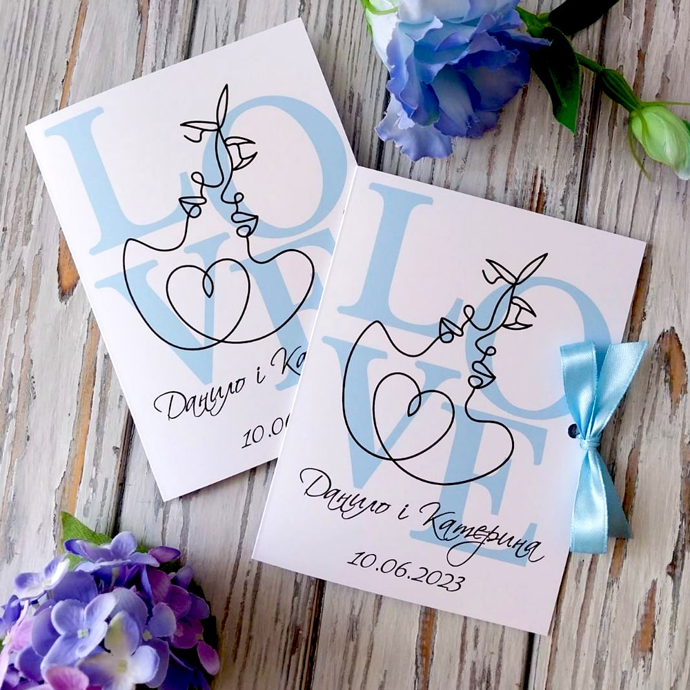 Запрошення йде з не зав'язаною стрічкою, опція зав'язування стрічки коштує 1,5 грн. - якщо потрібно, вкажіть її в коментарях до замовлення