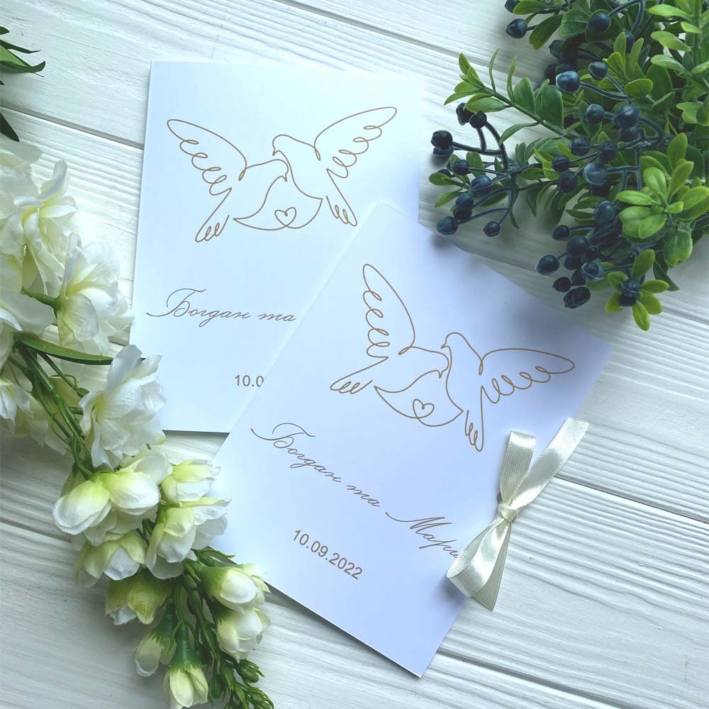Запрошення йде з не зав'язаною стрічкою, опція зав'язування стрічки коштує 1,5 грн. - якщо потрібно, вкажіть її в коментарях до замовлення