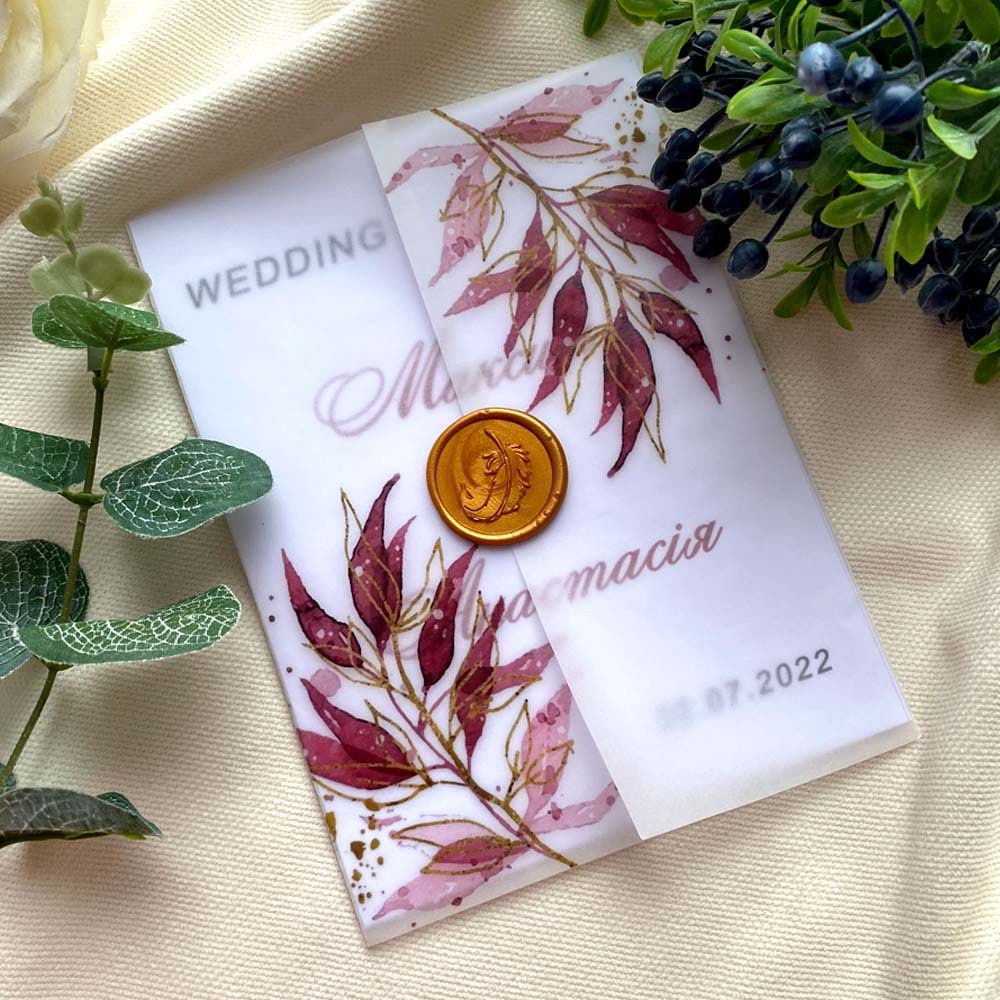 Запрошення ручної роботи з обкладинкою із напівпрозорої кальки з друком на ній.